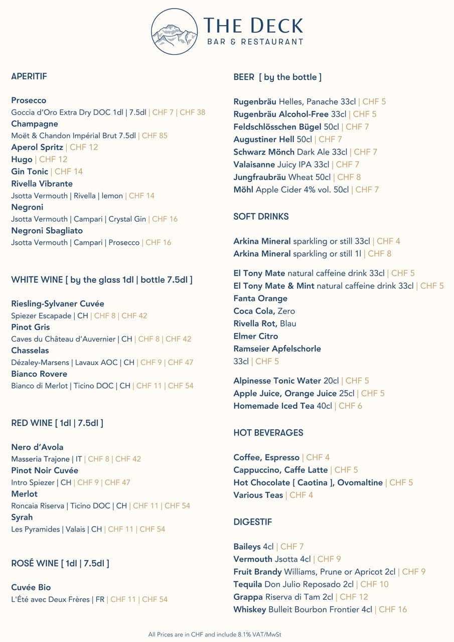 Ein Apéroplättli mit einem regionalen Bier, ein einheimisches Käsefondue mit einem guten Glas Weisswein oder unser beliebtes Steak mit Pommes Frites – in unserem Restaurant „The Deck“ können Sie verschiedene Köstlichkeiten geniessen. Bei schönem Wetter sitzen Sie auf unserer gemütlichen Terrasse mit wunderbarem Blick auf die Jungfrau. Ein Genuss für alle Sinne!