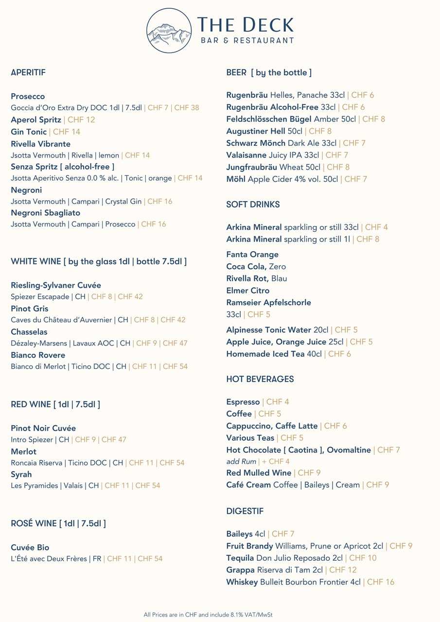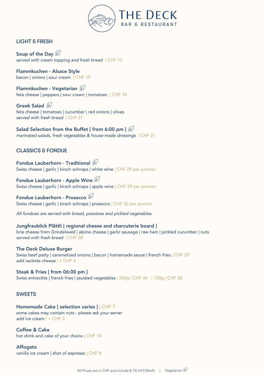 A meat & cheese platter and a regional beer, a local cheese fondue with a good glass of white wine or our popular Steak with Fries – in our restaurant “The Deck” you can enjoy various treats. If the weather is nice, you can sit on our cosy terrace with a wonderful view of the Jungfrau. A treat for all the senses!